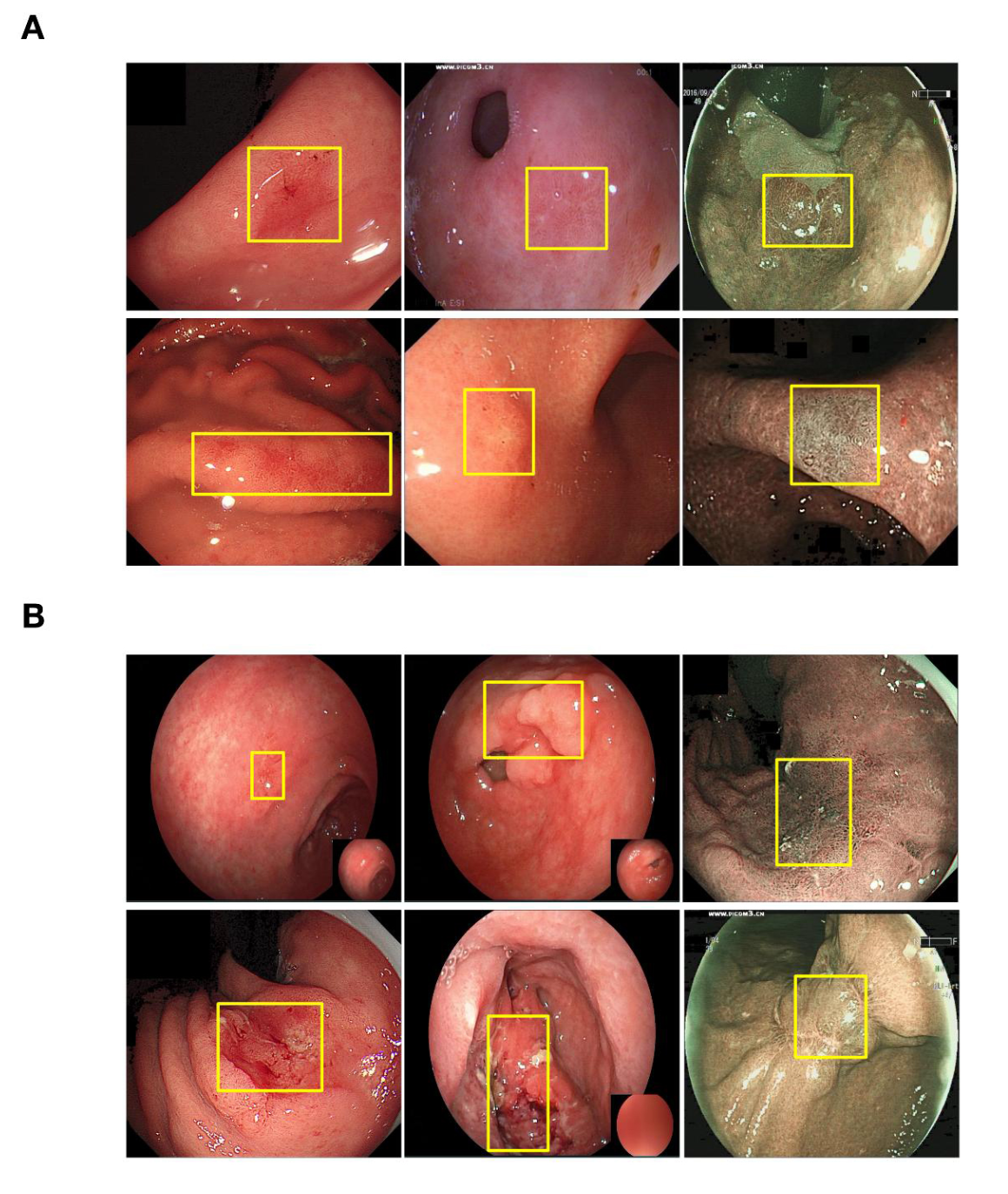 Top: annotated CAG training examples with bounding boxes at biopsy sites. Bottom: annotated GC training examples. Yellow boxes indicate lesion regions.