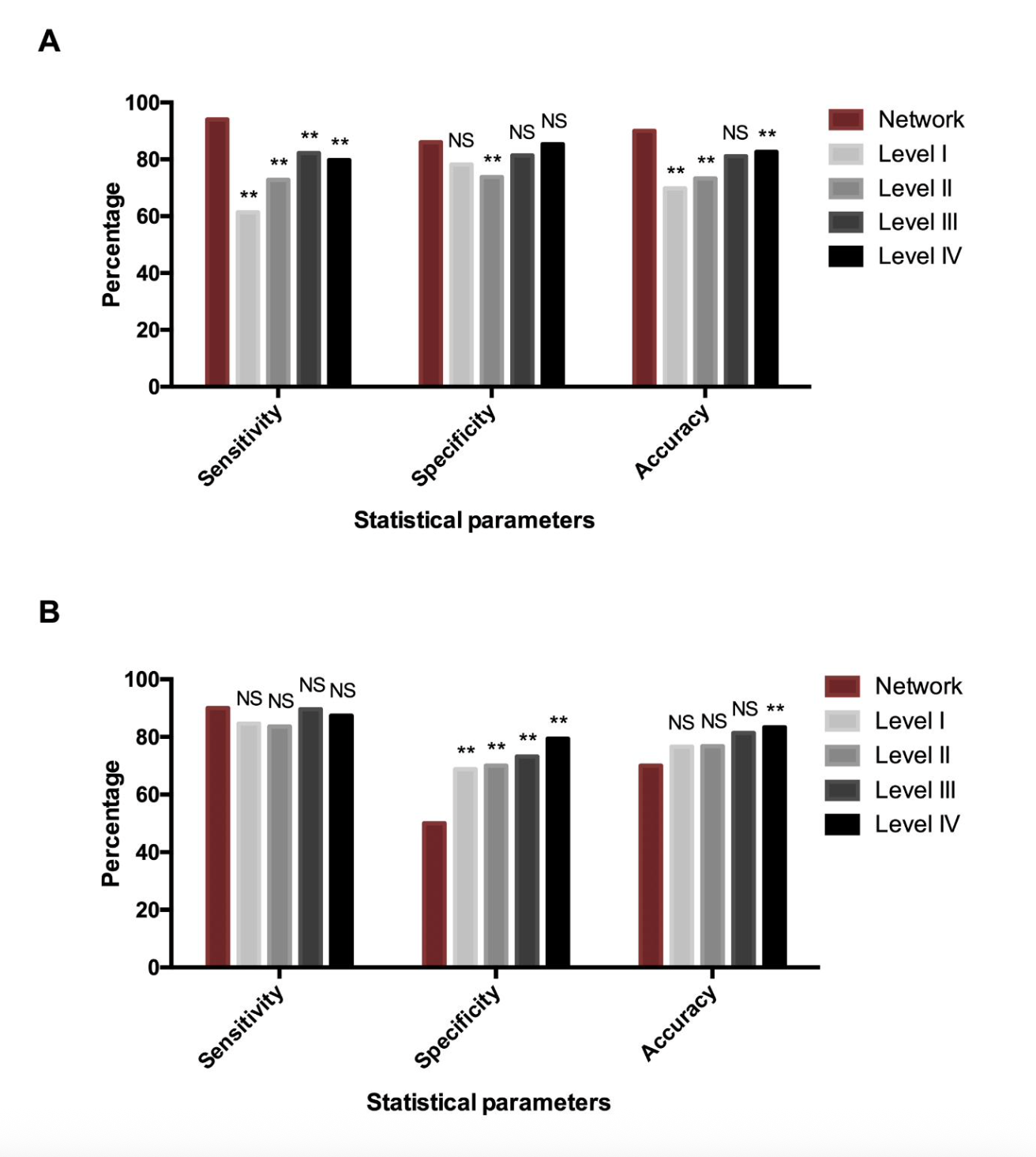 Comparison of diagnostic performance between the network and doctors stratified by seniority (Level I to IV). (A) CAG detection. (B) GC detection.